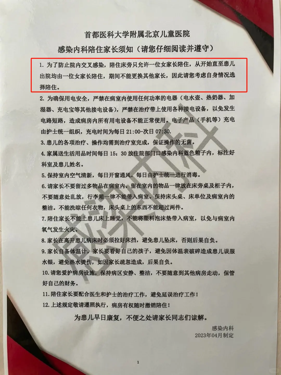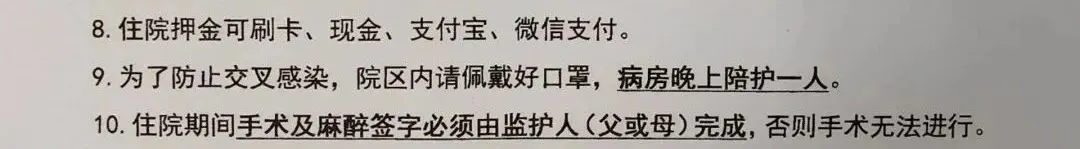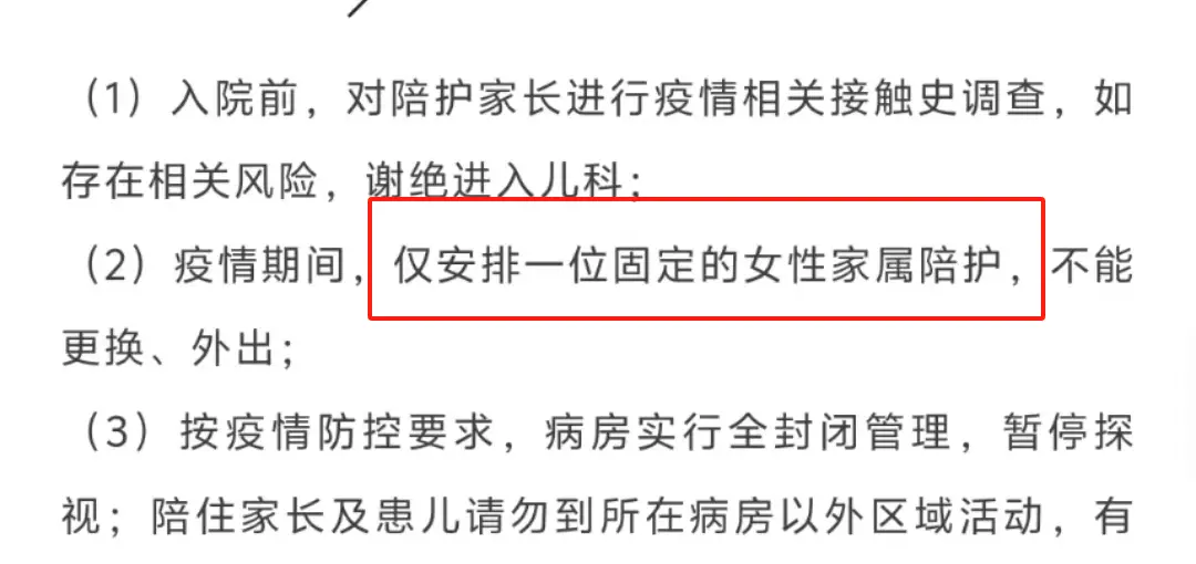 在该院感染内科的一份《陪住家长须知》中,可以找到这份家长陪护的详细规定,其中提到:「为了防止院内交叉感染,陪住床旁只允许一位女家长陪住,从开始直至患儿出院均由一位女家长陪住,期间不能更换其他家长。」