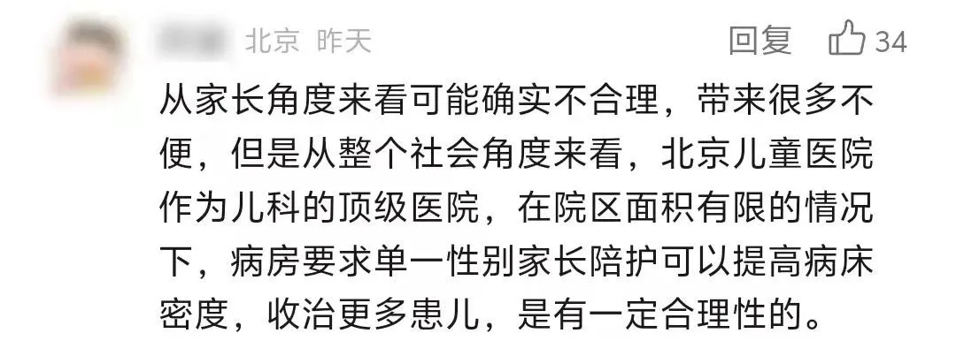 其次,统一陪护人员可能也会「方便」医院收治更多的患者。「北京儿童医院作为儿科的顶级医院,在院区面积有限的情况下,病房要求单一性别家长陪护可以提高病床密度,收治更多患儿,是有一定合理性的。」