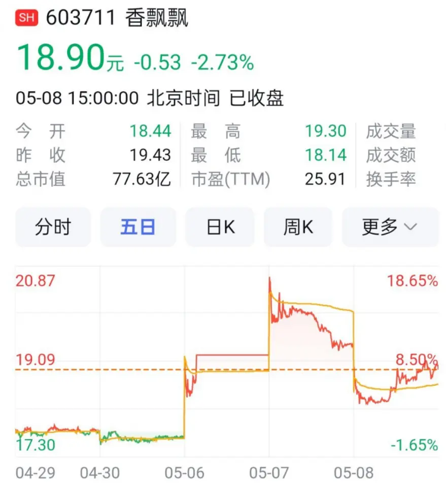 于是,香飘飘的口碑很快反转,从“国货之光”变成了“又一个割韭菜的”。5月8日,香飘飘的股价大跌,几乎回落至了涨停前的水平,直播间也恢复了往日的冷清。