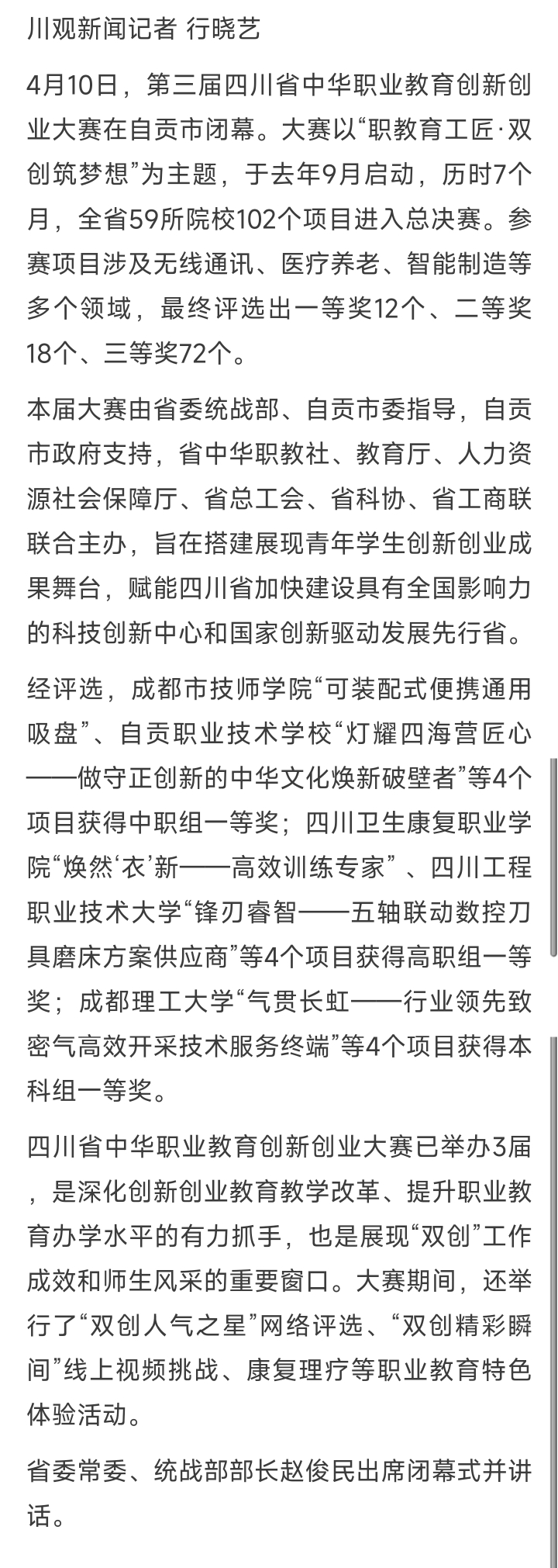 [盐都杂谈] 第三届四川省中华职业教育创新创业大赛在自贡闭幕