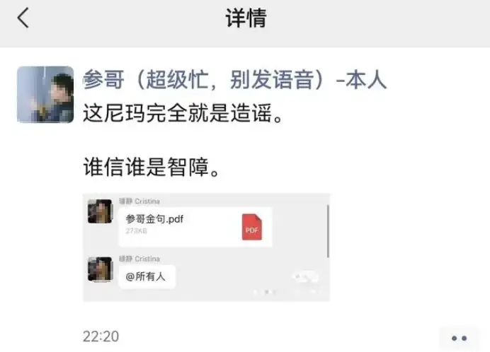 不过,对于网络上流传璩静让部门全体员工学习的“参哥金句”,被参哥予以否认,并称“这完全是造谣,谁信谁是智障”。
