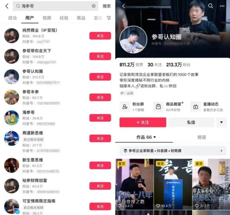 单从中专毕业的参哥“点化”高知百度原副总裁来看,其确实称得上商业 IP 孵化生意中的高端玩家,但参哥不过是千千万万个抖音卖课操盘者的缩影。