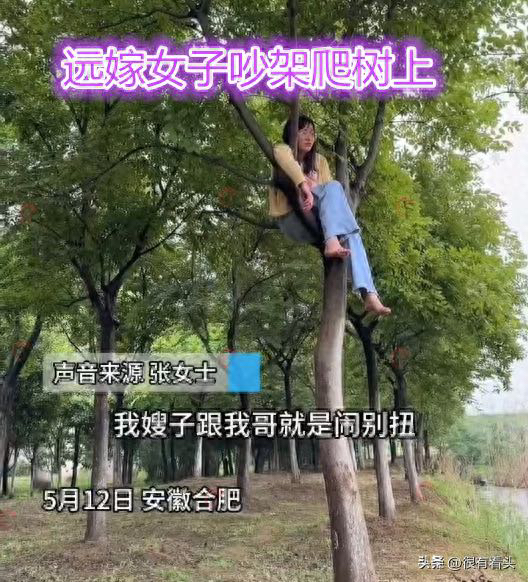 嫂子是远嫁过来的,一直和哥哥关系很好,不过也难免因为鸡毛蒜皮的小事吵架,这次吵得有点凶,嫂子就爬树上去了,哥哥也不想管,也不敢管,嫂子平时也喜欢爬树,这次是把孩子送上学,自己上树吹风了