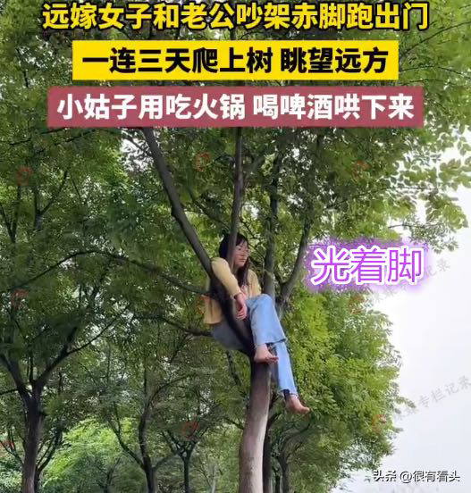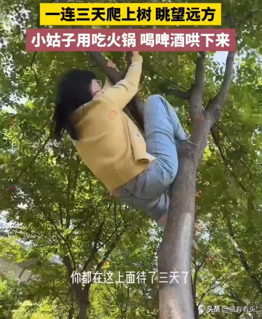 有人觉得嫂子是在树上呆了一整夜,其实没有,嫂子是早上爬上去的,虽然连续3天爬树,可能是心情不好,每当心情不好,嫂子就会爬树,自己知道嫂子的这个爱好