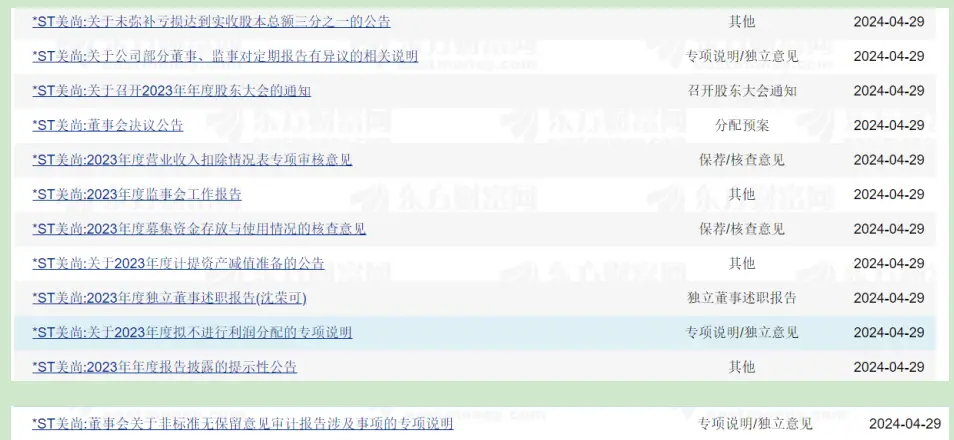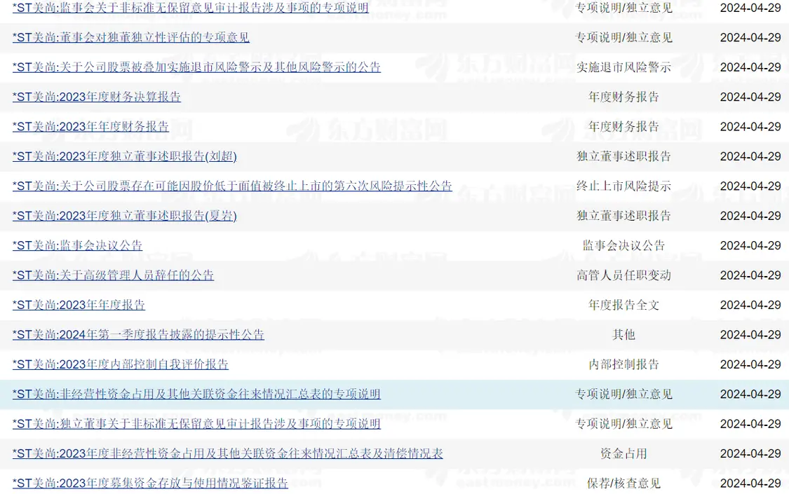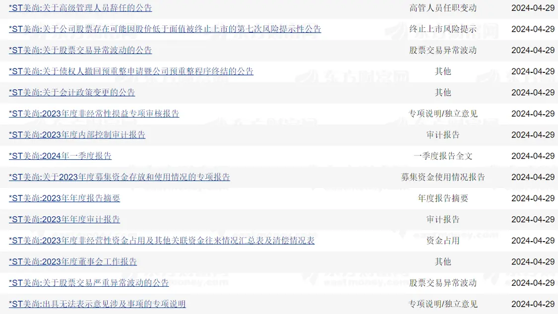 伴随着投资者的惨痛经历,*ST美尚的清算也在进行中。凤凰网《风暴眼》梳理发现,除了退市公告之外,仅4月29日一日,*ST美尚关于高级管理人员辞任、股票交易异常波动等公告就有近30条,一家退市上市公司的动荡基本面得以呈现。