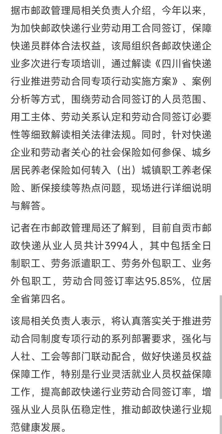 [盐都杂谈] 95.85%!自贡市邮政快递业劳动合同签订率全省第四