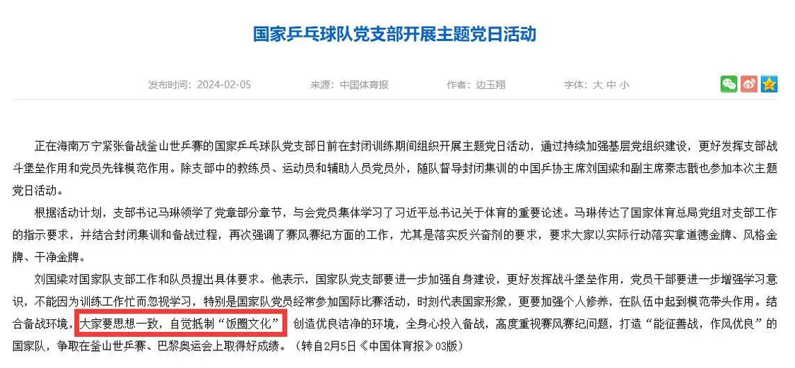 今年2月乒协主席刘国梁就在队内开了一次会,正式表态:结合备战环境,大家要思想一致,自觉抵制“饭圈文化”,创造优良洁净的环境,全身心投入巴黎奥运的备战。