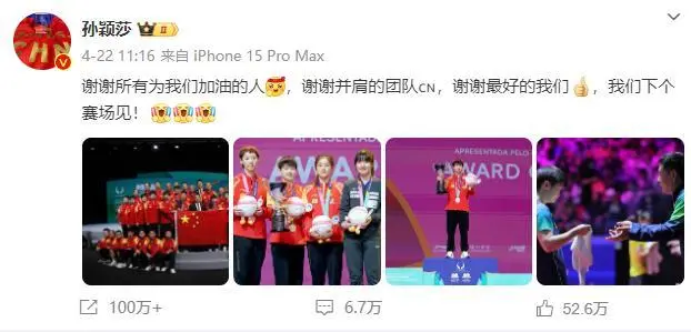 孙颖莎澳门站夺冠的微博评论6.7万,转发破百万