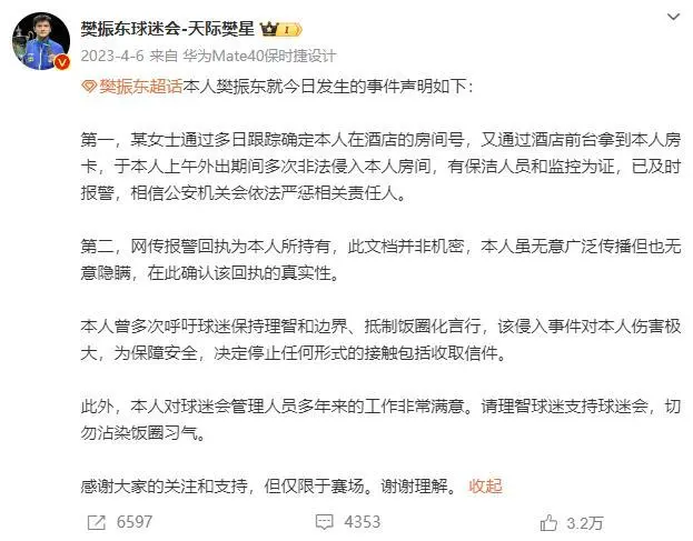 去年,樊振东曾遭极端粉丝非法侵入酒店房间