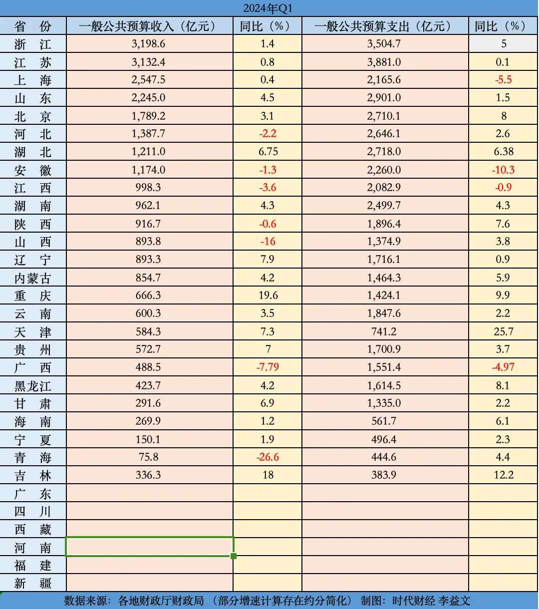 实际上,2024年一季度,地方财政收支增速与地区经济发展水平间出现较大偏移,省份间一般公共预算收入也出现较为明显分化。而在经济增速换挡、地方债务承压的大背景下,既要保障硬性民生支出,又要应对换挡转型期的收入波动,如何平衡财政收支,考验着地方智慧。