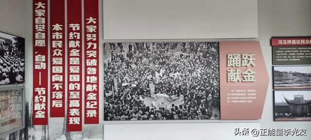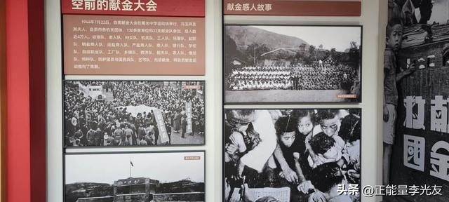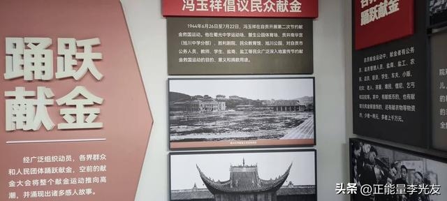 通过图片及历史资料了解了那段难忘的历史:1944年7月22日上午,自贡蜀光中学召开"节约献金救国大会",冯玉祥及夫人到场,4万余民众,从自流井、贡井、大文堡、富顺县及10个乡镇,带着献金,向蜀光中学操场涌来,老人队、儿童队、妇女队、工人队各式各样的团体,都打着锣,敲着鼓,吹着号,放着鞭炮,冲上献金台来。