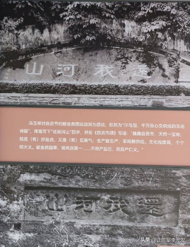 冯玉祥对自贡节约献金救国运动深为感动,称其为“汗与泪、千万良心交织成的无名诗篇”,挥毫写下“还我河山”四字,并在《自贡市颂》写道:“巍巍自贡市,天然一宝地;既是(有)好盐卤,又是(有)瓦斯气;生产复生产,军民赖供给。文化程度高,个个明大义。献金救国事,输将居第一……不但产盐巴,而且产仁义。