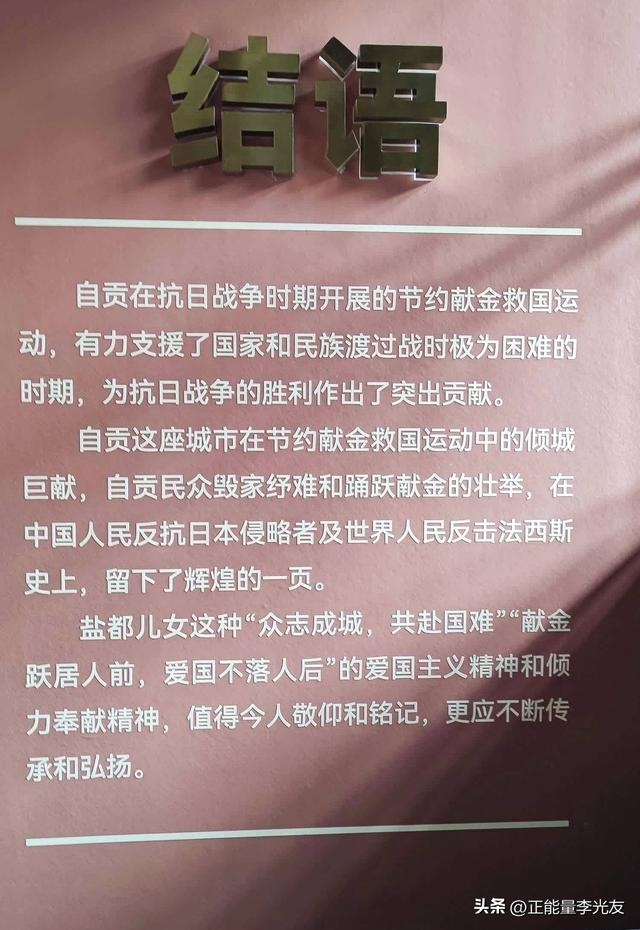 当时,自贡人民还生活在水深火热之中,为了国家存亡,为了抗日救国,他们节衣缩食,慷慨倾囊。竟然居抗日献金之首,我身为自贡人为当时的自贡前辈的善举、贡献而骄傲,感动!特作以下打油诗一首: