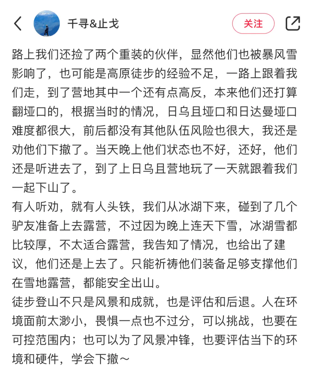 户外需要经验,但又不能太信任自己的经验,“淹死的都是会水的”,保持谨慎和谦卑永远不会错。