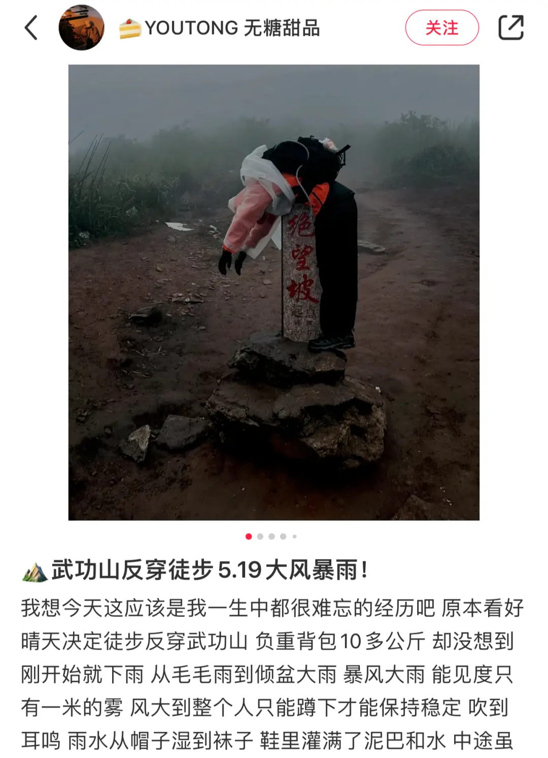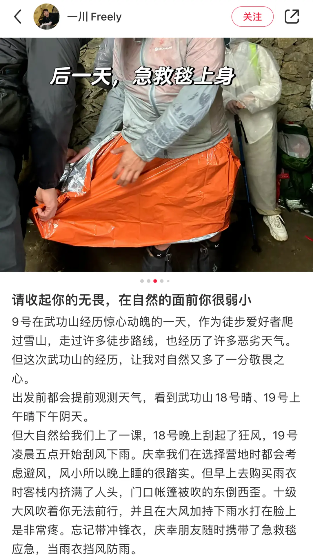 一名97年的徒步爱好者,在武功山反穿线路上遭遇意外,发生失温。