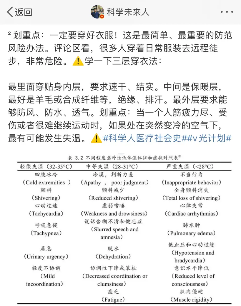 有一部分网友评论认为“失温应该是常识”,然而对于没多少山野户外经验的普通爱好者来说,知道这个概念容易,却很难有多么深的实际体会。