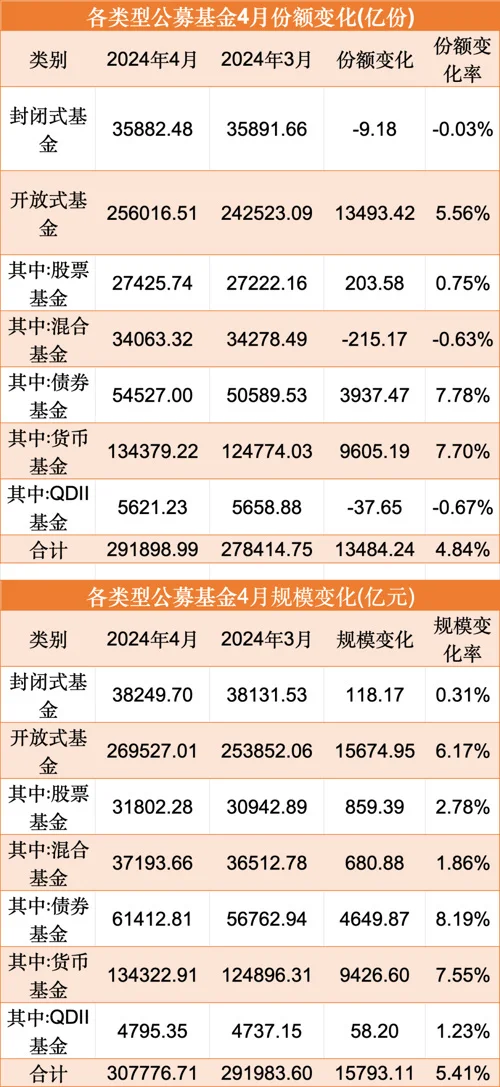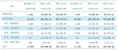 相比3月份,公募基金4月份的单月规模增加1.58万亿元,环比增长5.41%。4月末公募基金整体份额达到29.19万亿份,环比增长4.84%,规模增长速度超过份额增幅。