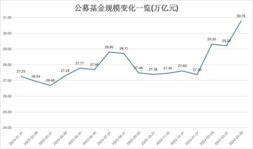 5月23日晚间,中国基金业协会发布最新一期公募基金市场数据。截至今年4月底,公募基金总规模达到30.78万亿元,相比3月份增长近1.5万亿元,助推总规模首次站上30万亿元大关。