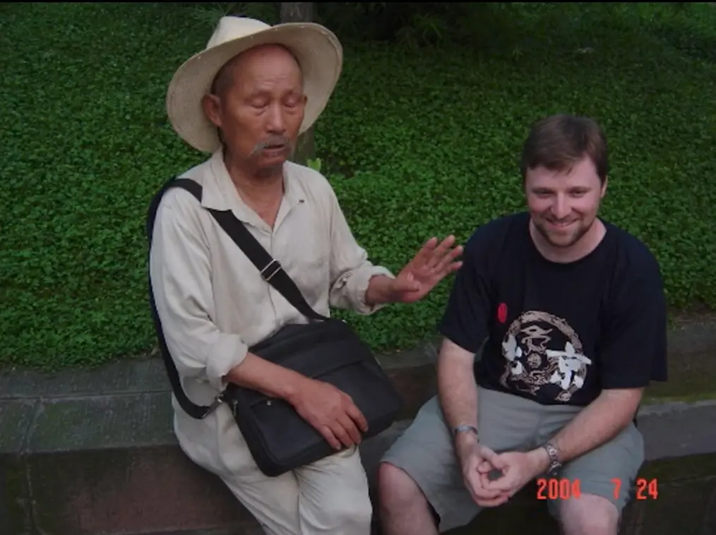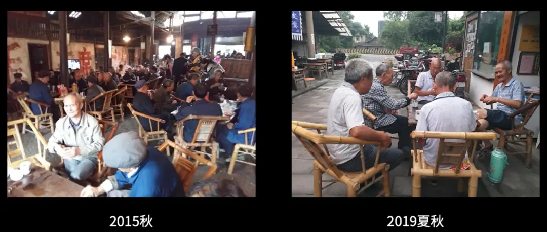 但当时由于疫情防控,我没办法回到内地,所以我找了四川大学的一位研究生,把照片给他,请他到观音阁老茶铺找一找,结果那位同学第一次去就找到了甘大爷。这是那位同学拍的照片,左边这位是甘大爷。而且他还告诉我,坐在他对面那位是胡大爷,胡大爷也同样出现在2015年和2019年的照片里。我说,这简直是太不可思议了。