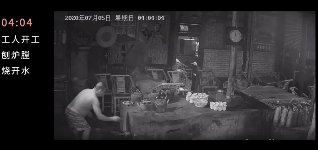 半夜的12点54分,李强的母亲李大妈就已经从内室走出来,开灯、开电视,开始了一天。到了早上4点刚过,三个工人陆陆续续进到茶馆,开始掏炉膛,准备烧水。到了大概5点,老板李强已经坐在茶馆里边开始喝早茶。早上5点过,一些摄影爱好者来到茶馆开始拍摄,他们自己带了演员来,一个演川剧的、能吐火的演员开始表演,他们就利用茶馆作为背景拍摄。到了5点40,李强开始出马表演掺茶,是热气腾腾的味道,老茶馆的味道。