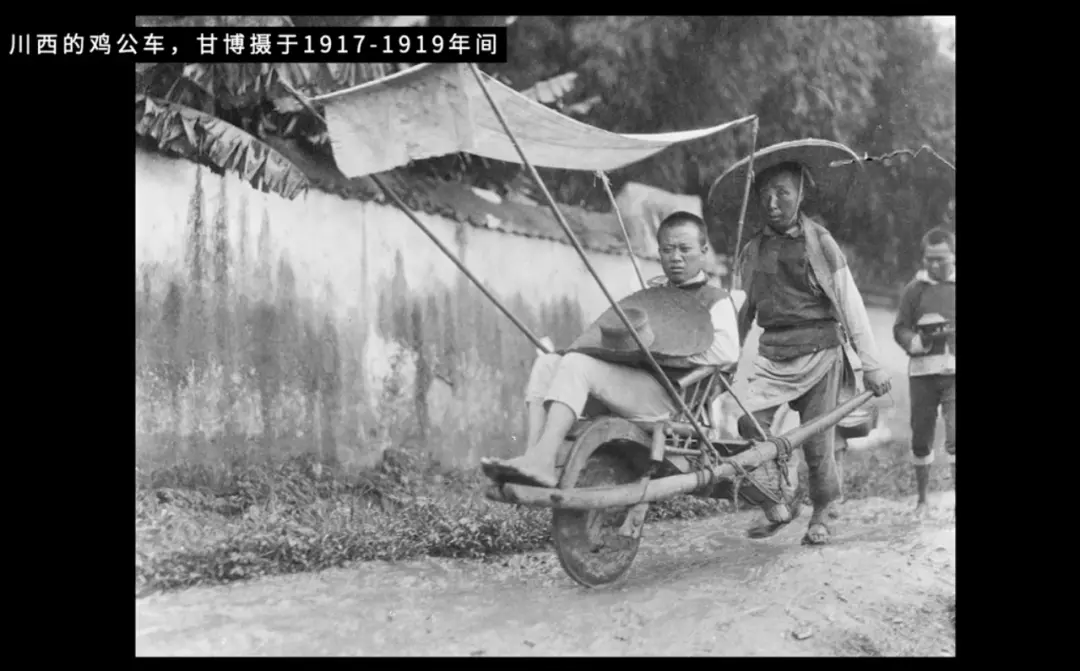 那么我要问,成都为什么有那么多茶馆?实际上这个是各种因素共同造成的。首先是它的交通,还有它的环境。大家看到右边的图,这叫鸡公车。大家如果到过华北平原都可以感觉到,华北平原一马平川,如果要运货运客人,即使是在过去的传统社会,也可以用牛车、马车,可以走得很快。但是成都平原是丘陵地带,道路非常窄小,所以运货载客都要依靠这种人力推的鸡公车,推的人走了一段路,就要休息,就要喝茶,所以沿着小道有很多茶摊茶棚,后来就发展成茶馆。这是一个因素。