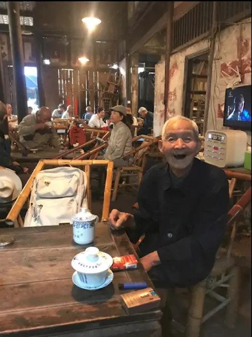 以这个观音阁老茶铺为例,当地的老人都在那里喝茶。大家看左边那张照片,这张照片是我2021年拍摄的,那年这位老人已经97岁了。大家看到桌上摆的两种不同的茶,分别用茶杯和茶碗装,在那个老人面前是一个茶杯,这里的茶对当地的老人,好多年都没有涨过价,都是一元钱一杯。但是如果你是从外边来的,不管你是来喝茶也好,来摄影也好,都是10元钱,给你端上的是用三件套的盖碗茶。当然茶还是有区别的,盖碗茶的茶质肯定要好一些,茶叶是比较高档的。茶杯里面的茶就是比较大众的茶。