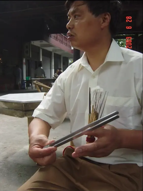 我也和茶馆里掏耳朵的人聊过天。有一次在成都大慈寺文博大茶园,掏耳朵的是个中年人,大概四五十岁,他告诉我他来自成都双流,就是成都的郊区,他每天和他的妻子骑摩托车过来,但是由于来自郊区,他们不能骑进城,只能骑到成都的二环路,放在他姐姐家,然后走路到大慈寺。他每天在那里给人掏耳朵,他的妻子在那里给客人擦鞋。