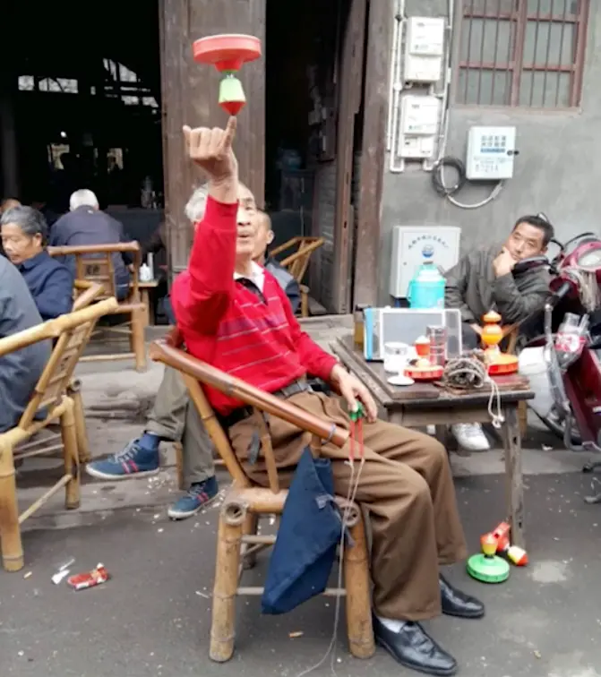 右边那个照片也很有意思,是我2015年有一次去茶馆,看到这个老人在那里玩响簧。但他并不是卖响簧的,他看到大家都在围观,我也在照相,他玩得特别起劲。这些老人在这种空间中找到了他的归宿。我想如果每天到这里来,他们的寿命可能都要长一些。