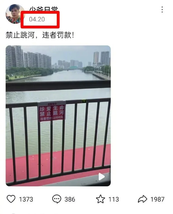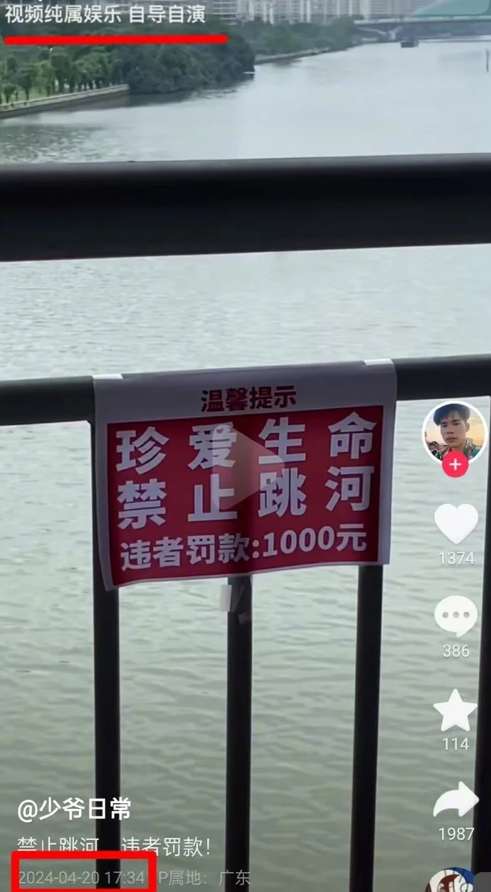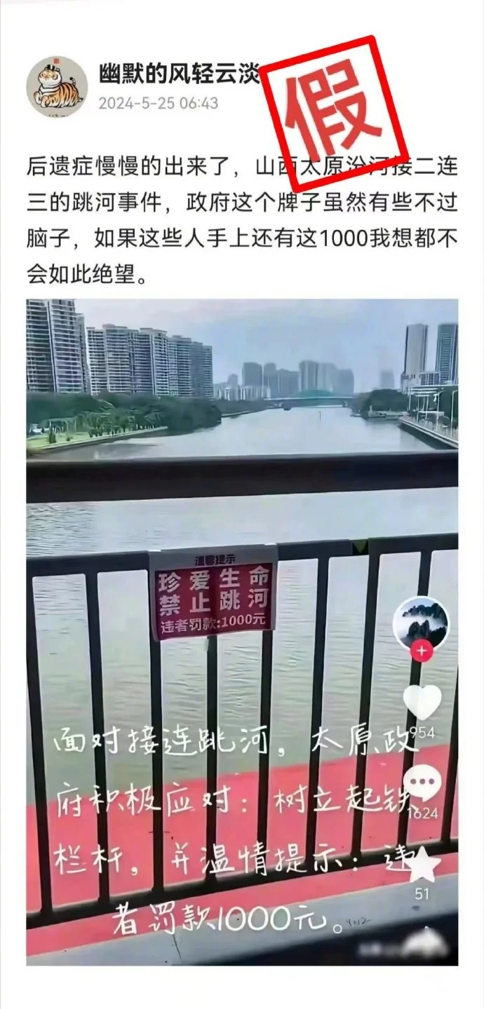 然而经老胡核对,这张图显然是移花接木的,与“太原跳河轻生”传闻毫无关系。该图至少今年4月20日就在互联网上出现了,五一期间“胖猫”事件爆出后,一些相关评论带上了这张图,现在这张图又被移到太原,我想主要是图中的那块牌子看上去有些滑稽。4月20日发布这张图的视频中间夹着一句话:“视频纯属娱乐,自导自演”。所以不排除图是通过AI技术制作的。如果它就是针对轻生者所挂出来的,要罚跳河轻生的人1000元,实在荒唐至极。