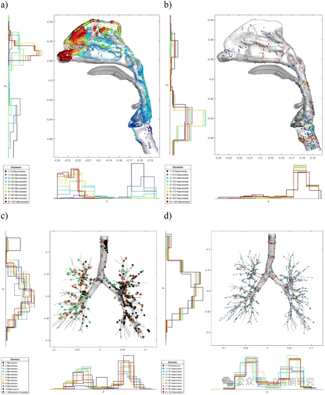 结果显示,在正常的呼吸速率下,微塑料可以覆盖鼻腔内表面的一半。在较慢的呼吸速率下,中等大小的微塑料颗粒主要沉积在上呼吸道,包括鼻腔、声带和气管与喉部的连接处。而更小的颗粒则在上呼吸道和下呼吸道中较为均匀地分布。