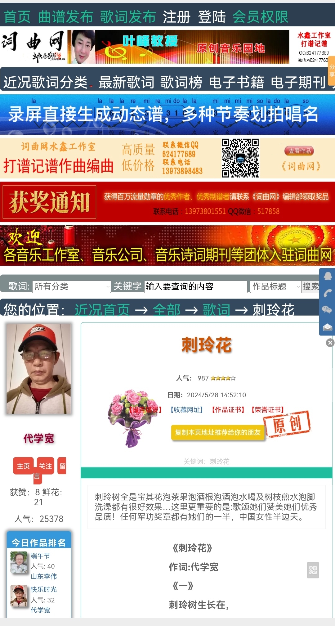 原创作品作词人同意后可谱曲