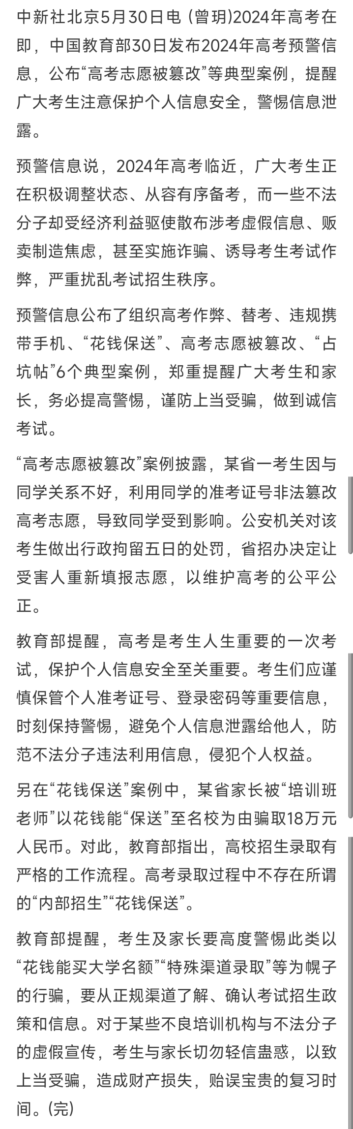 [盐都杂谈] 中国教育部发布高考预警信息 提醒考生警惕信息泄露