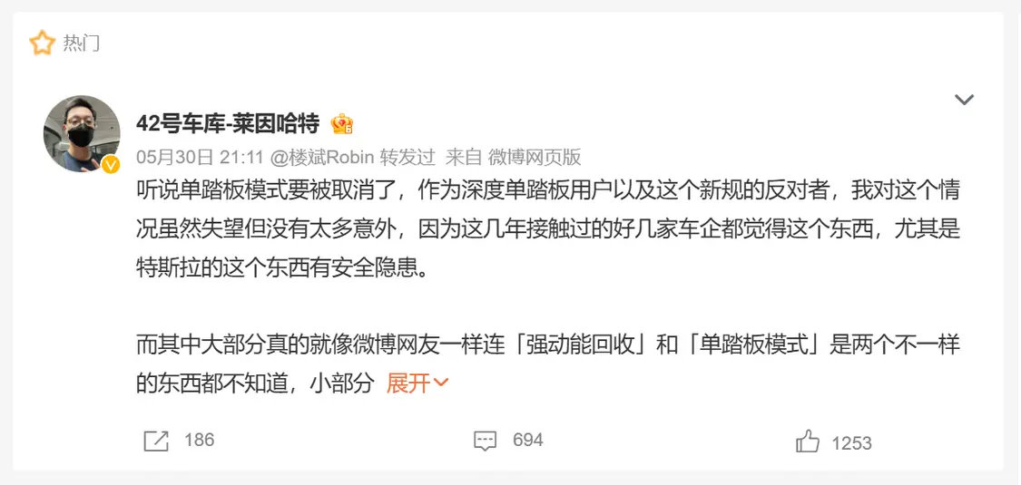 网络上对单踏板的看法不一,众多支持取消单踏板的声音当中,也有反对取消的。