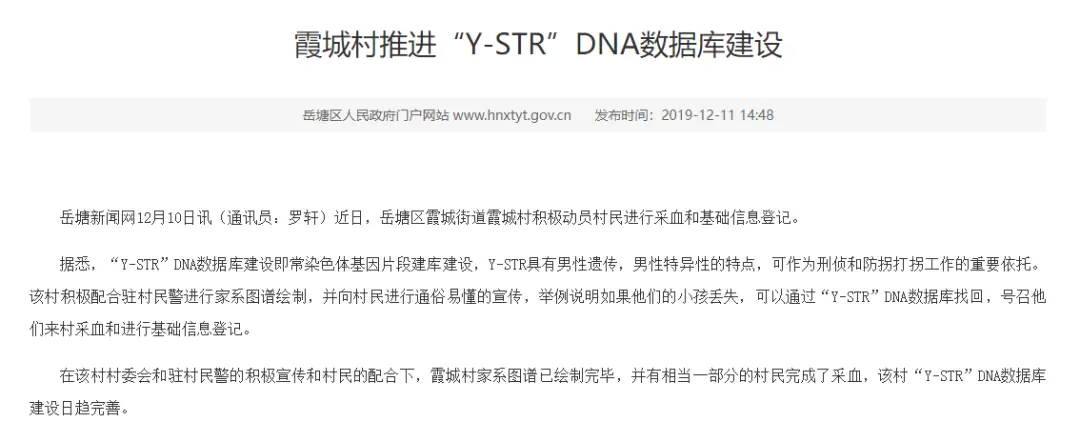 湖南湘潭岳塘区霞城街道霞城村在2019年,就已经推进Y-STR数据库建设|图源:岳塘区政府门户网站截图
