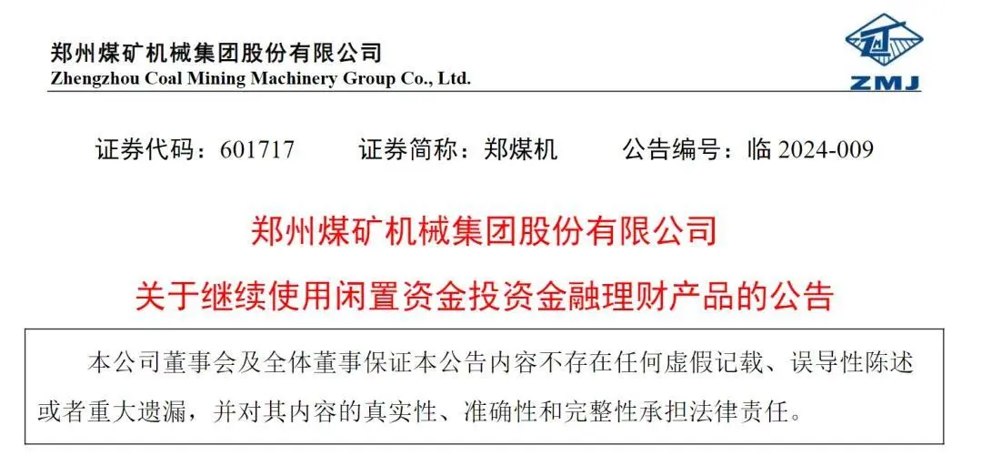 3月29日,郑煤机发布了使用闲置资金进行理财的公告,其中指出拟在12个月内使用不超过70亿元的闲置自有资金购买理财产品。