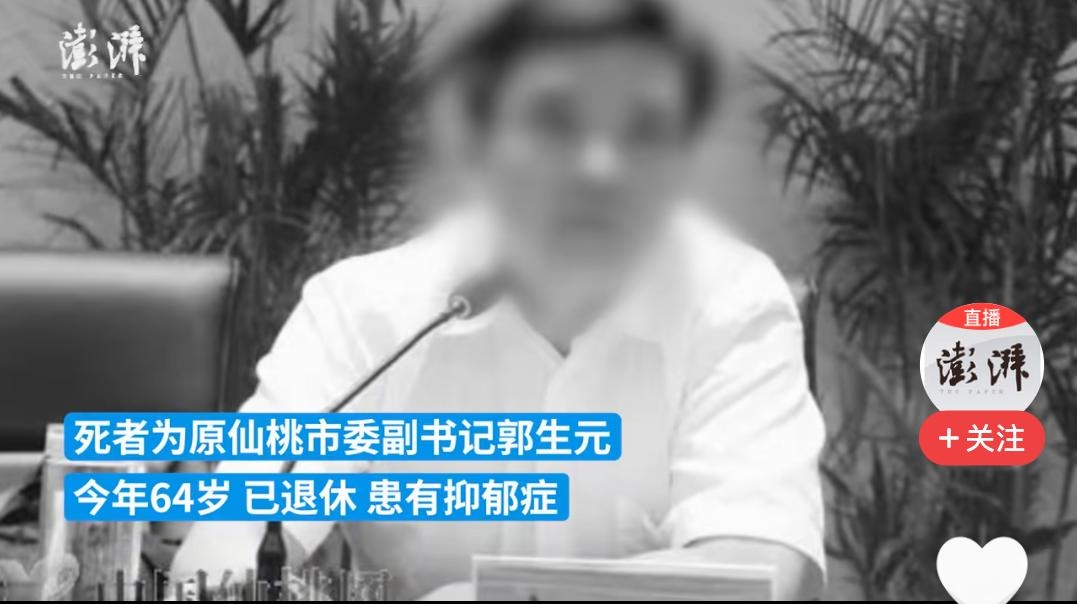 又一官员坠楼身亡,令人遗憾和震惊!澎湃新闻刚刚发布的消息,原仙桃市委副书记郭生元就医后于6月6日在酒店坠亡,知情人透露:郭生元已退休,患有抑郁症。