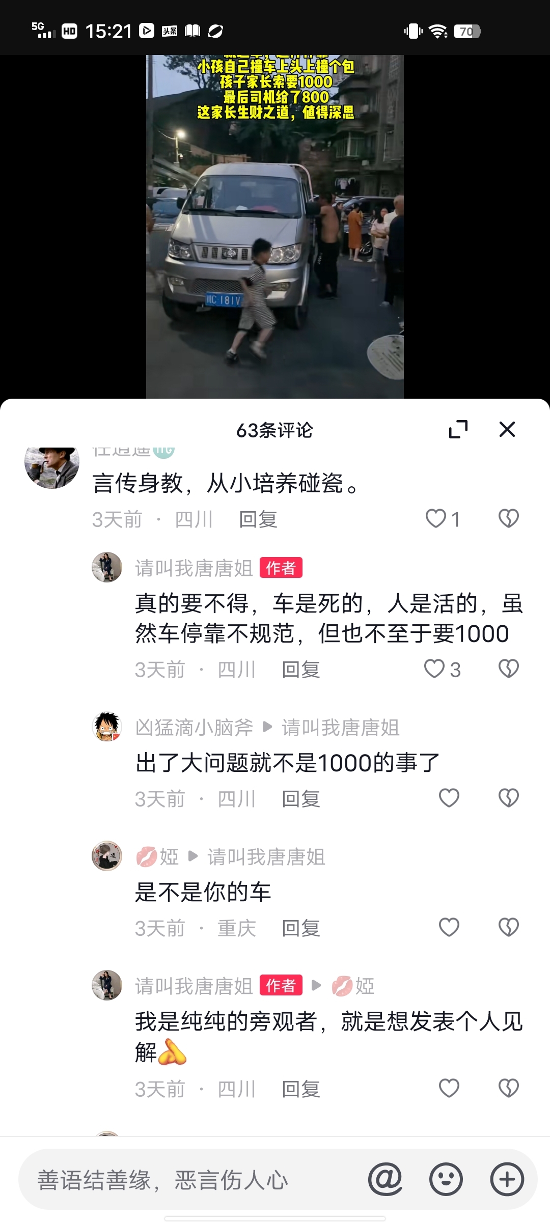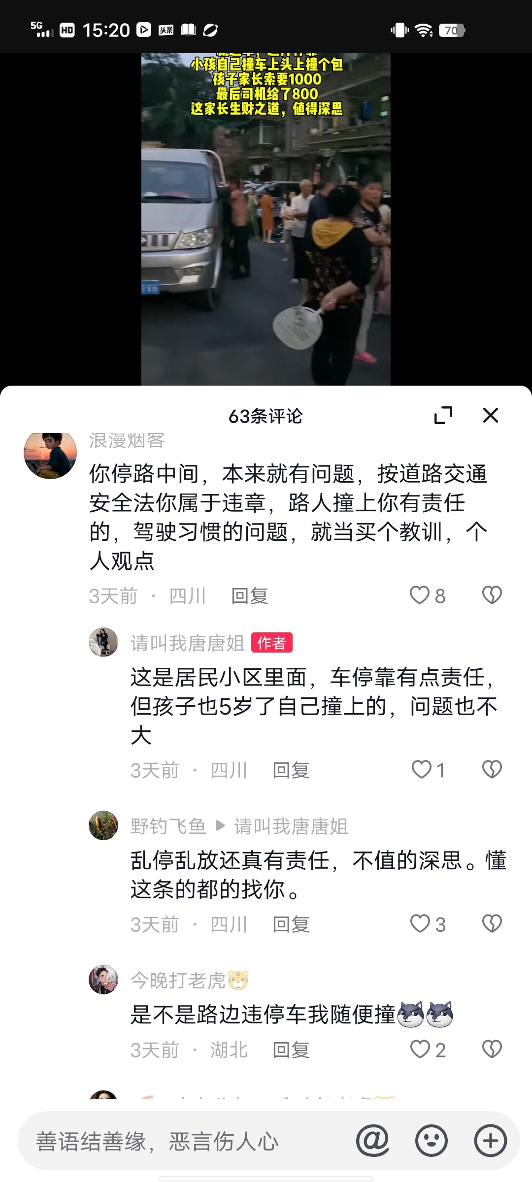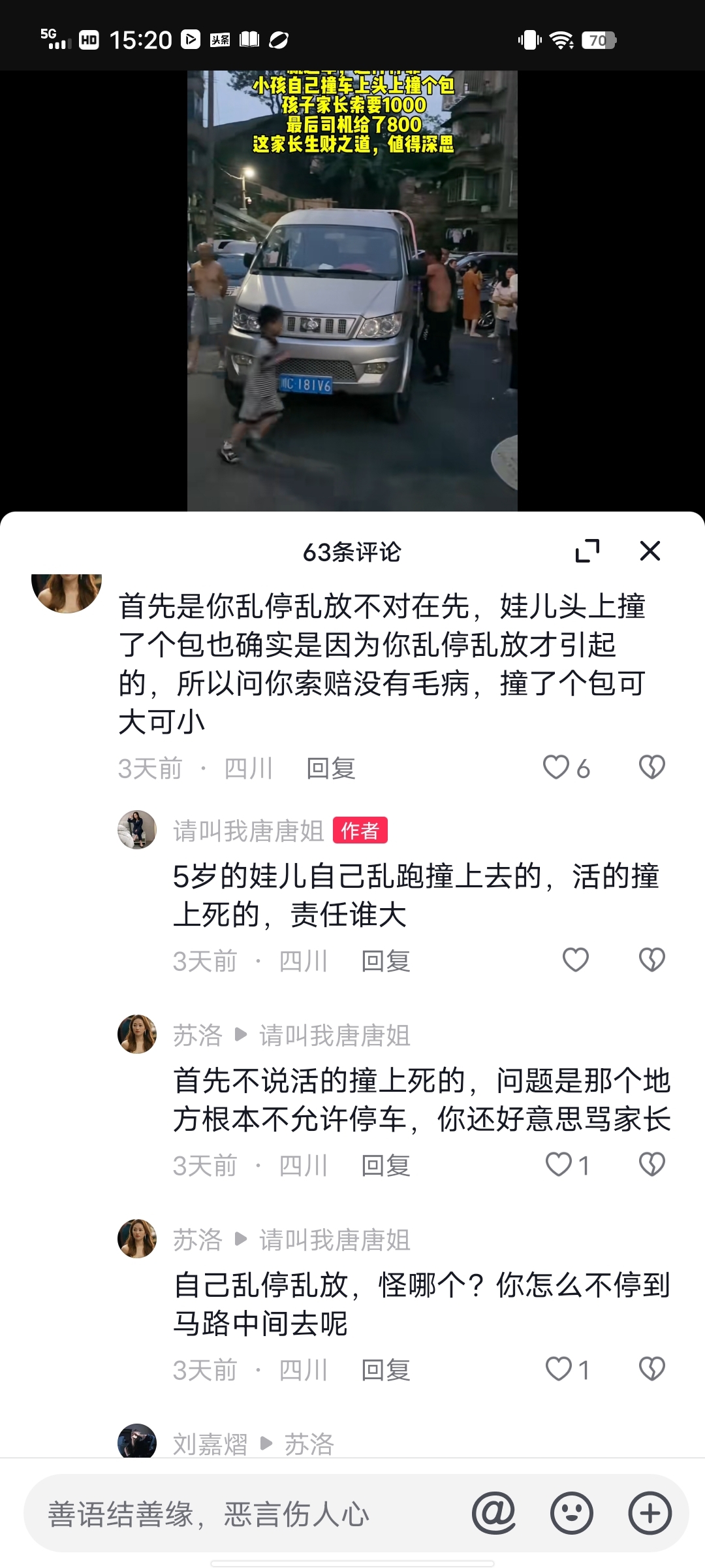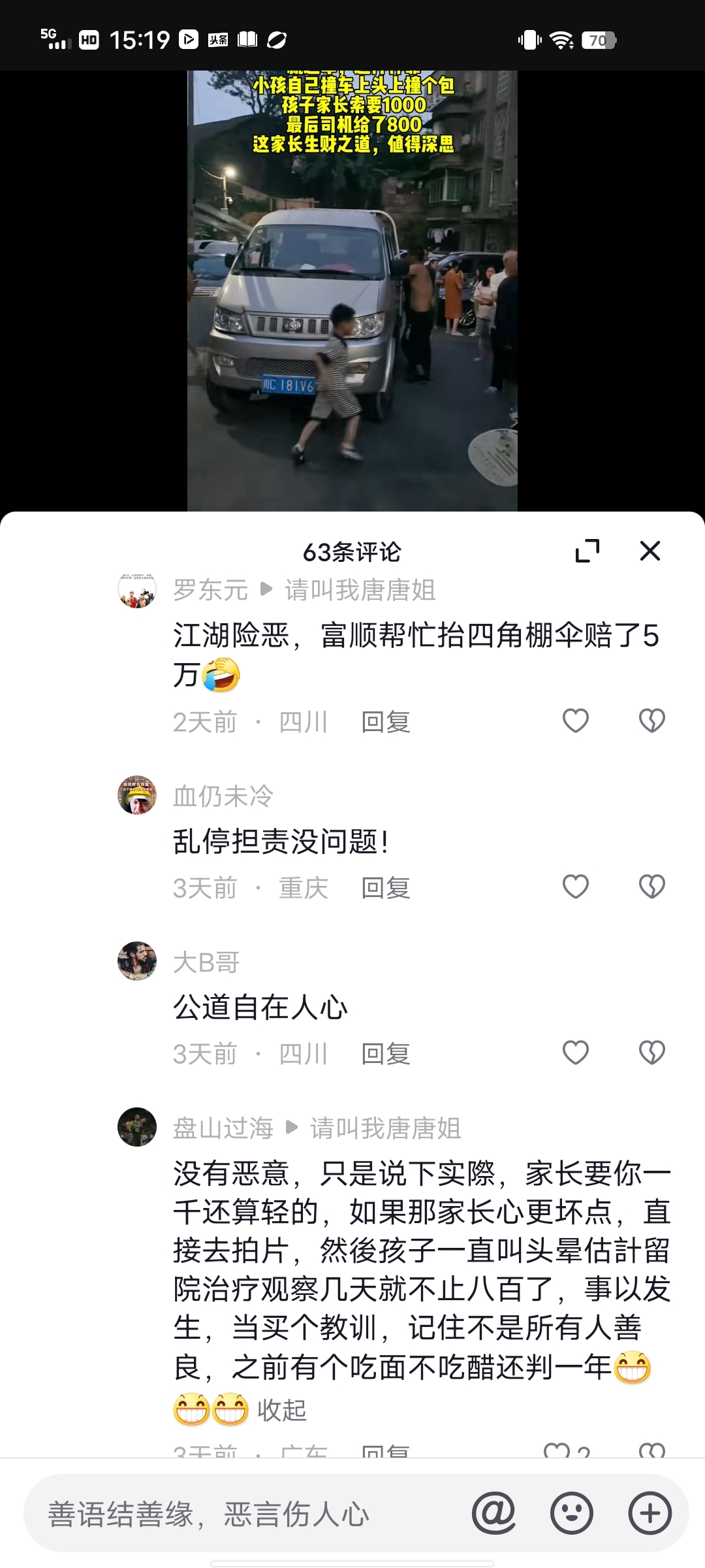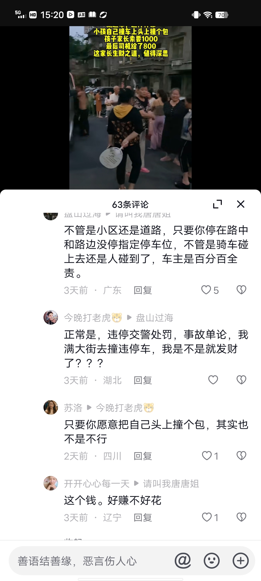 看嘛以下就是我刚刷抖音看到的,一小车乱停放在居民小区里面,五岁的娃儿自己撞上了,家长索赔1000元,最后司机赔了800