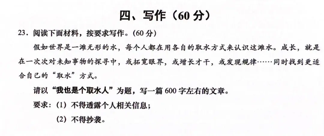 今年上海中考作文给的材料是“假如世界是一滩无形的水,每个人都在用各自的取水方式来认识这滩水……同时找到更适合自己的‘取水’方式”,要求的作文题是《我也是个取水人》。陈教授说,在“这滩水”“一滩无形的水”中“取水”,给人感觉是要在急流险滩中“取水”,倒也可以认为是大有深意的。