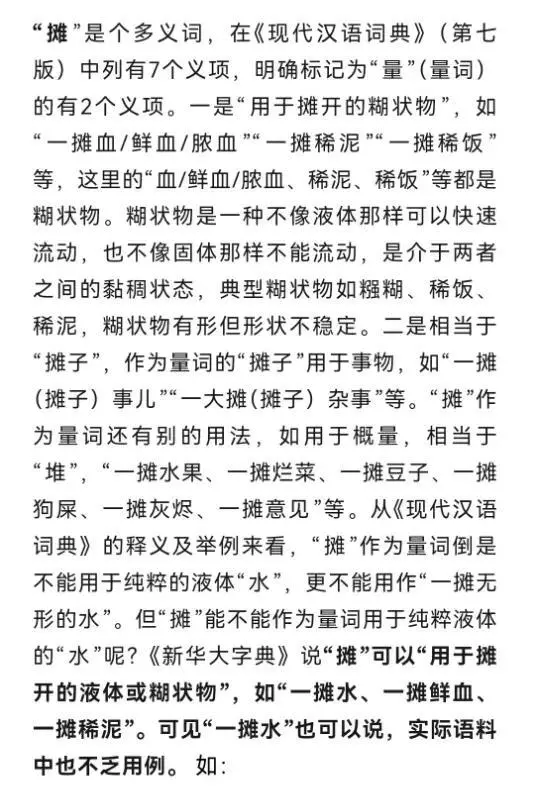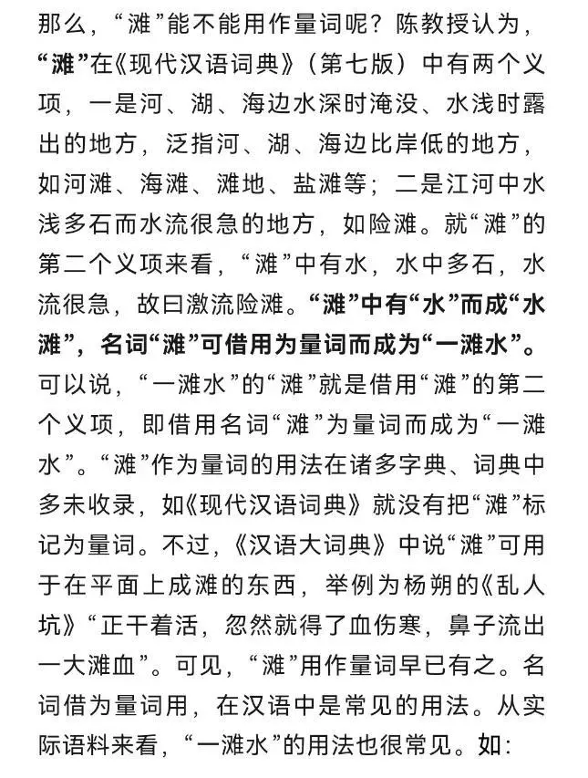 陈昌来教授说,“一滩水”和“一摊水”的争论由来已久,有人认为只能用“一摊水”,而不能用“一滩水”,原因就在于“滩”不能做量词。其实,“一滩水”也好,“一摊水”也罢,关键在于“滩”和“摊”的用法,以及它们能不能与“水”搭配。