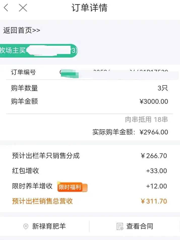 上述投资者给记者发过来的一张订单截图显示,3只羊对应的购羊金额是3000元,对应的预计出栏销售总营收为311.7元。下单时间是2024年2月,预计出栏时间是2025年2月。也就是说,这笔投资的预计年化收益率约为10.4%。