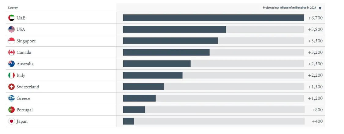 (注:Henley & Partners预计2024年百万富翁净流入最多的10个国家)