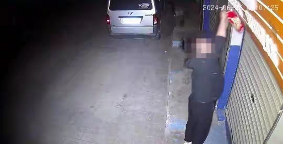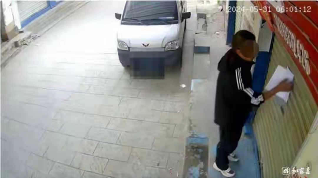 问题就在于,烟草局提交给法庭的送达通知书的过程全部都是“摆拍”的。两名工作人员于2024年5月29日、31日清晨6时许,多次前往阮双全原经营地址,张贴这份原本三年前就该送到的《收回烟草专卖许可证通知书》及送达回证,拍完照之后就撕下,伪造2021年3月4日的送达过程。第一次摆拍时,无意中拍下了店面2024年春节张贴的春联,于是第二次两人又去了,撕了人家“恭喜发财”的春联横批,重新摆拍。这一整个荒唐又无语的过程,都被现在在该地址经营的母婴店的监控拍下来了,如此费尽心机地伪造送达通知书的过程,就为了让自己的行政决定显得不可驳斥,没有漏洞。