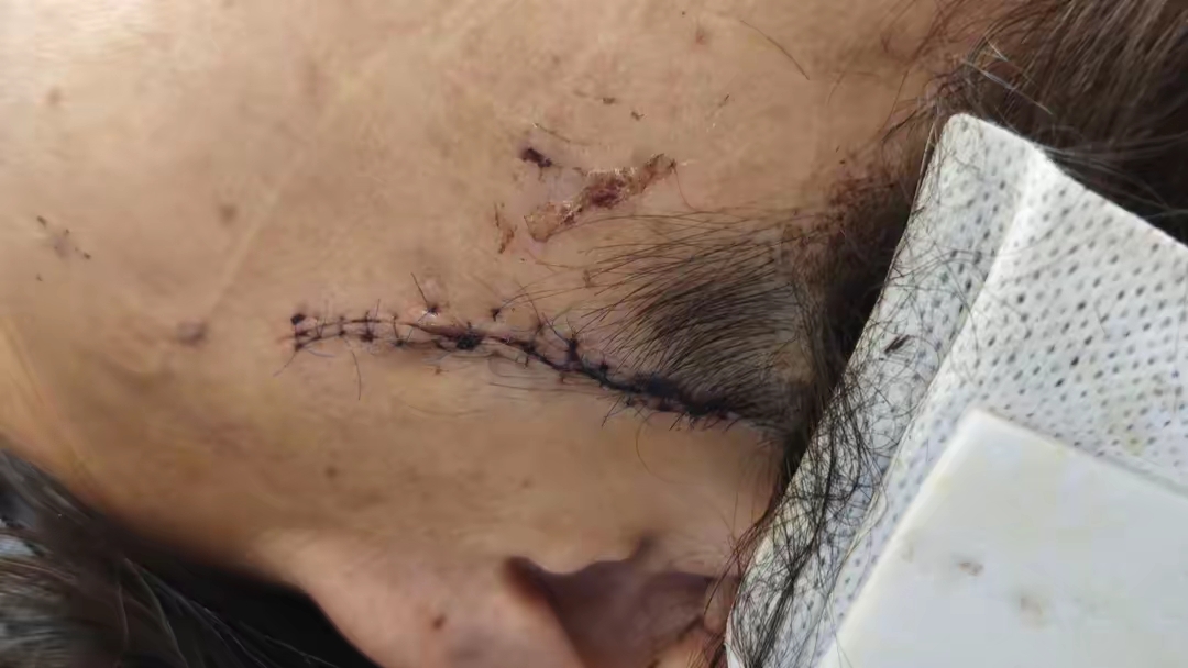 随后朱女士被120送到了温医大附二院龙湾院区急诊科就诊。“当时朱女士被送过来的时候,就能看到她的左侧脸颊靠近耳旁有一个比较长的撕裂伤口,还一直在渗血。”急诊科医师叶浩拓表示,在经过检查后发现,朱女士的左侧颜面部,被划了一个约10cm的创口,伤口较深,深达骨面。此外,朱女士左侧头枕部还有一个鸽子蛋大小肿块,CT显示头皮血肿。随后叶浩拓为朱女士进行了面部清创缝合,由于朱女士受伤的面部皮下组织已经分离,所以里外共缝了近30针,即使伤好后还会留疤。