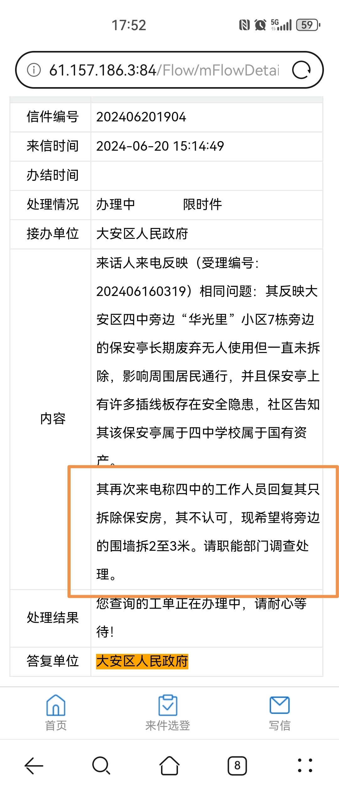 另外有朋友有说不了解过程,现在我来说说:我们这些居民的房子以前是四中学校里面围起的,后面由于学校新修了围墙将我们避出来了,但是一直不拆除没用的闲置保安房以及围墙,相当于杜杜把我们这些居民围在一个圈子头的,而且安全通道很窄只有一米多,所以在2022年底我们就一直找四中协调拆除,同时有两次高于所有居民除在校老师(大家都懂得,这种情况不会参与)80%联名签字盖手印找四中及相关部门协调,但是四中一直不作为拿那个保安房是国有资产搪塞,故一直没拆除下来,现在是最近一个月多以前大家才反应过来,那个闲置保安房就根本是个没手续的违章建筑,所以大家又再次找四中及相关部门协调拆除,后面是在本周,相关部门查实确属于违建,同时下达了整改拆除意见,但是另外那个保安房旁边的围墙也是四中修建的,且也闲置,并将我们的通道变窄,故有了再次找相关部门协调的举措,但是确遇大安区教体委工作人员这种解决问题的态度,真不能认同,反射出基层群众办事难的处境,有问题可以说可以沟通,但是不能以这种为了回复而回复,走过场且态度恶劣,素质低下的做法吧!另外结果就是回复不会拆除围墙,但试问围墙你们四中修的,不要了,而且把新围墙退进去了,这个旧的不拆来阻挡我们的安全通道是为何?如果打开这两米多,我们的通道会变成四米左右,不打开就只有一米多一个门洞大,难到这不是和我们息息相关吗?我们自行维权难到不对吗?何至于你们回复的如此草率,如此武断!另外我这里还有其他大安教体委工作人员回复内容,比如还查我们投诉居民的隐私的,比如我们好久搬过来的等,可见是如何解决问题的,让人觉得人生都不安全了。所以平大家看看,实事如何可以就地随时了解!