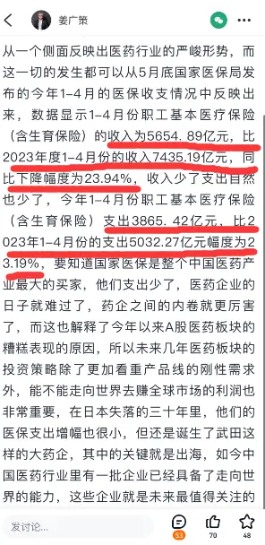 6月19日,知名医药行业基金经理姜广策在雪球发帖称,“5月底国家医保局发布的数据反映出,今年1-4月份职工基本医保基金收入比去年同期下降23.94%,支出也比去年同期下降23.19%”,并表示医保基金是当前整个医药产业最大的买家,医保基金支出少了,医药企业的日子就难过了,药企之间的“内卷”就更厉害了,而这也解释了今年以来A股医药板块糟糕表现的原因。