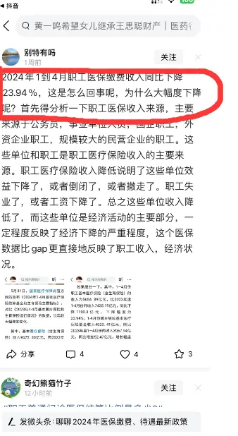 记者梳理发现,今日头条@别特有吗曾在6月6日06:49发帖称:“2024年1到4月职工医保缴费收入同比下降23.94%”。这是《每日经济新闻》记者截至发稿前在网络上找到的发布时间最早的一篇文章。