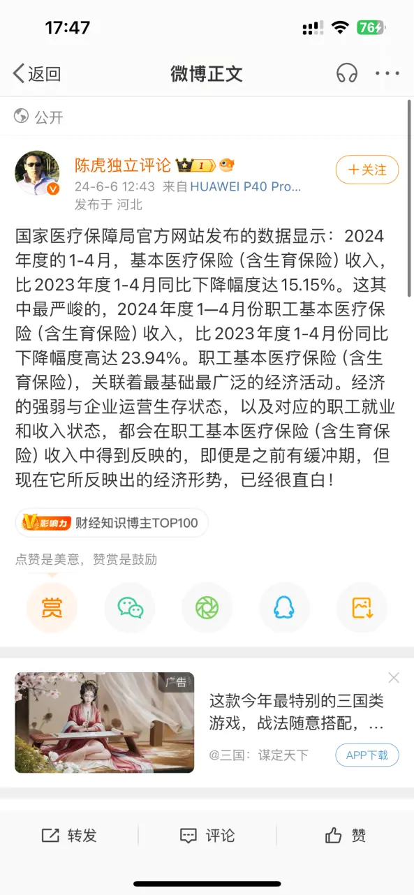 在这条帖子发布后约3小时后,雪球出现了类似说法。其后,微博、抖音平台也开始流传这一说法,微博大V@陈虎独立评论(粉丝数17.7万,29万转评赞)于12:43发微博表示:2024年度1-4月基本医保比去年同期下降15.15%,职工基本医保比去年同期下降23.94%……