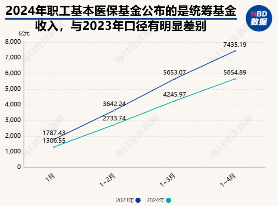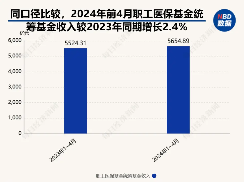 统一口径后再来进行对比,2024年1-4月,职工基本医疗保险基金统筹基金收入5654.89亿元,去年同期统筹基金收入5524.31亿元。相比之下,今年的职工基本医疗保险基金统筹基金收入非但没有下降,反而还增长了2.4%。