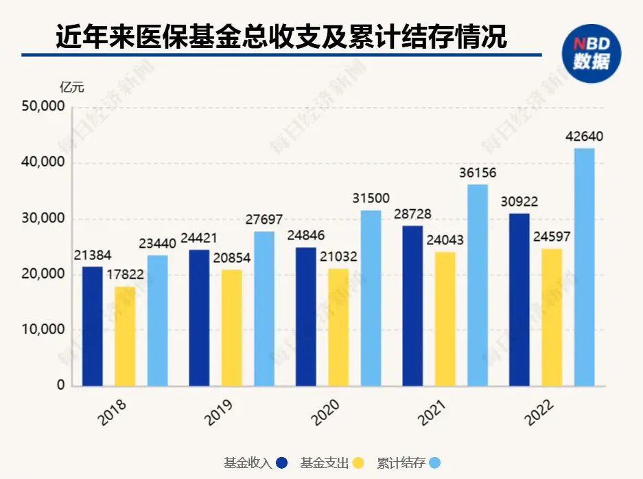 2022年,基本医疗保险基金总收入30922.17亿元,总支出24597.24亿元,年末累计结存42640亿元。