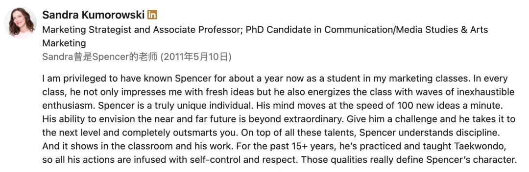 “当时他是我市场营销课的学生。Spencer 是一个真正独特的人。他的思维速度为每分钟 100 个新想法。他预见近期和远期未来的能力超乎寻常。给他一个挑战,他会将其提升到一个新的水平,完全胜过你......在过去 15 多年里,他一直练习跆拳道,所以他的所有行为都充满了自制力和尊重。这些品质真正定义了 Spencer 的性格。”
